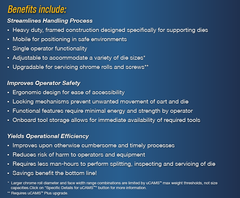 uCAMS™ Plus maximizes workplace efficiency three fold by providing capabilities to service cast/film sheet dies, chrome rolls and feed screws in one complete system. Versatile, mobile and functional the uCAMS™ Plus provides service operators with advantages that can't be achieved with a simple die cart.