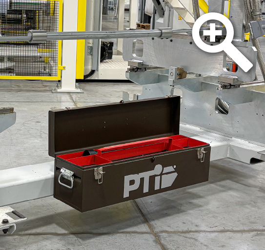 Large toolbox securely stores service supplies, trunnions, and tools.